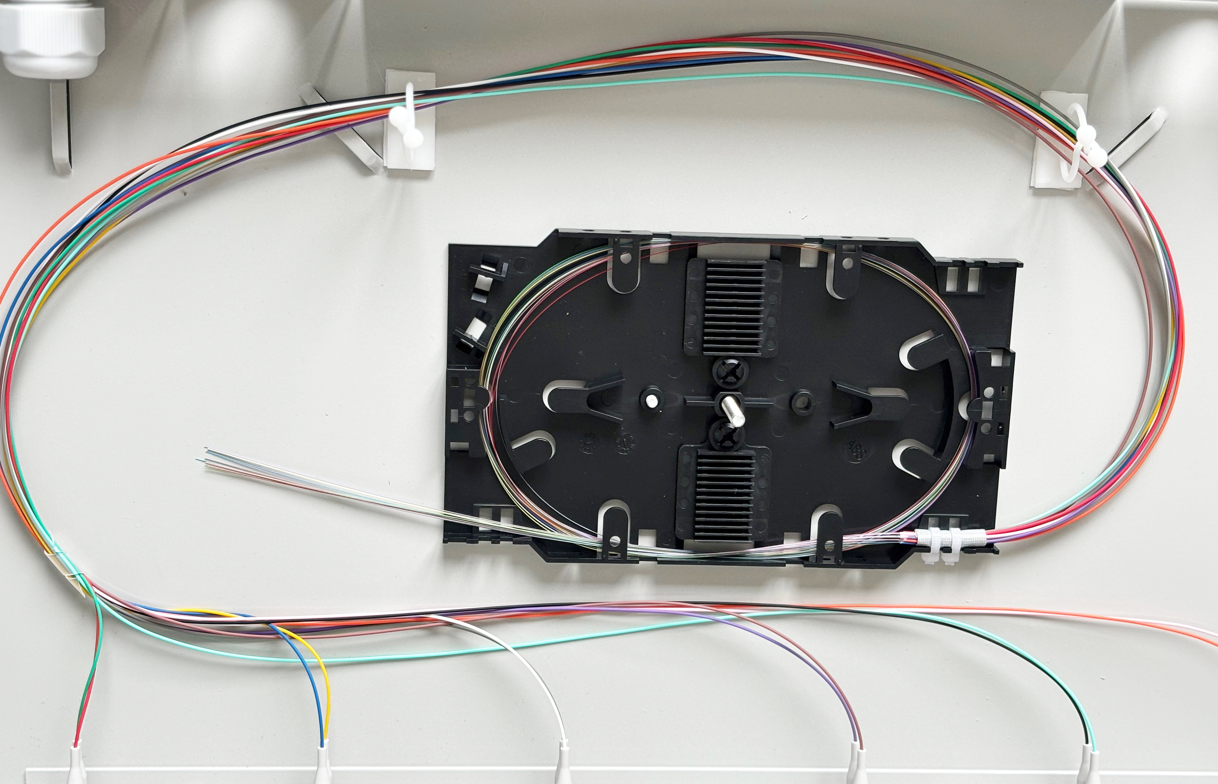 Die Pigtails sind gemäß DIN Farbcodierung in die Kupplungen gesteckt und spleißfertig in der Spleißkassette eingelegt.