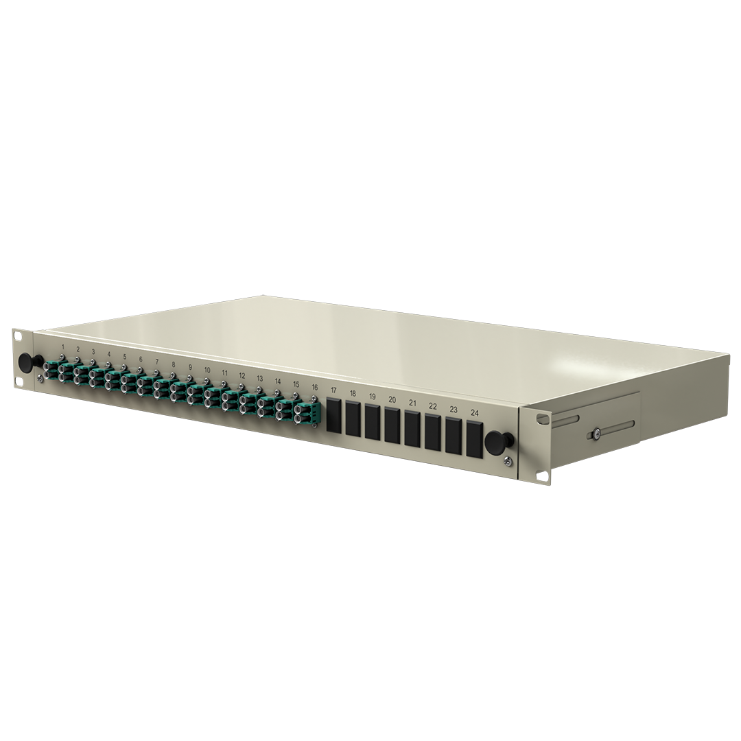 - Frontplatte: 19" (483mm) mit montierten LC duplex Kupplungen