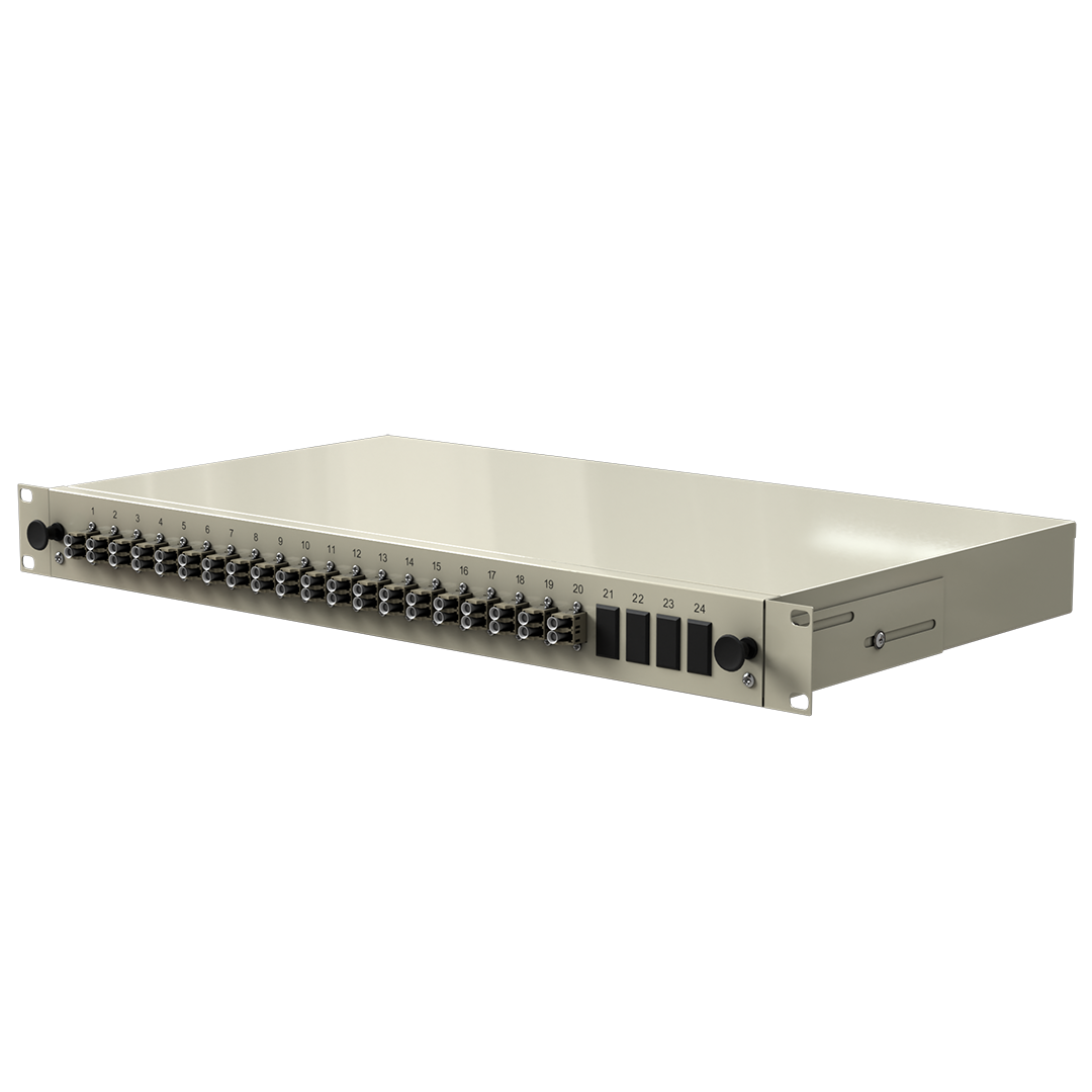- Frontplatte: 19" (483mm) mit montierten LC duplex Kupplungen