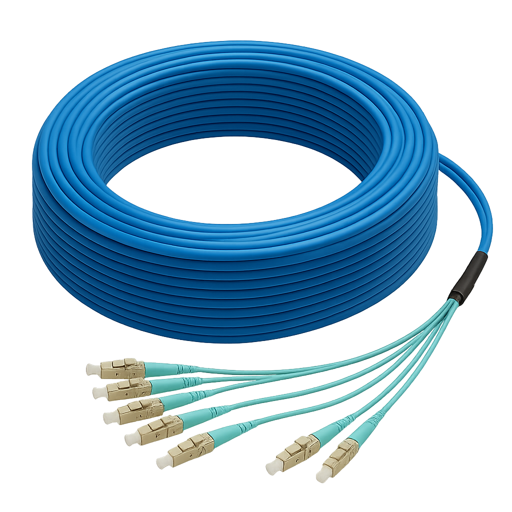 Vorkonfektioniertes LWL-Universalkabel U-DQ(ZN)BH OM3 mit 4 Fasern und LC/LC-Steckverbindern. Ideal für den Innen- und Außenbereich, montagefertig inklusive Messprotokoll. Nicht für die direkte Erdverlegung geeignet.